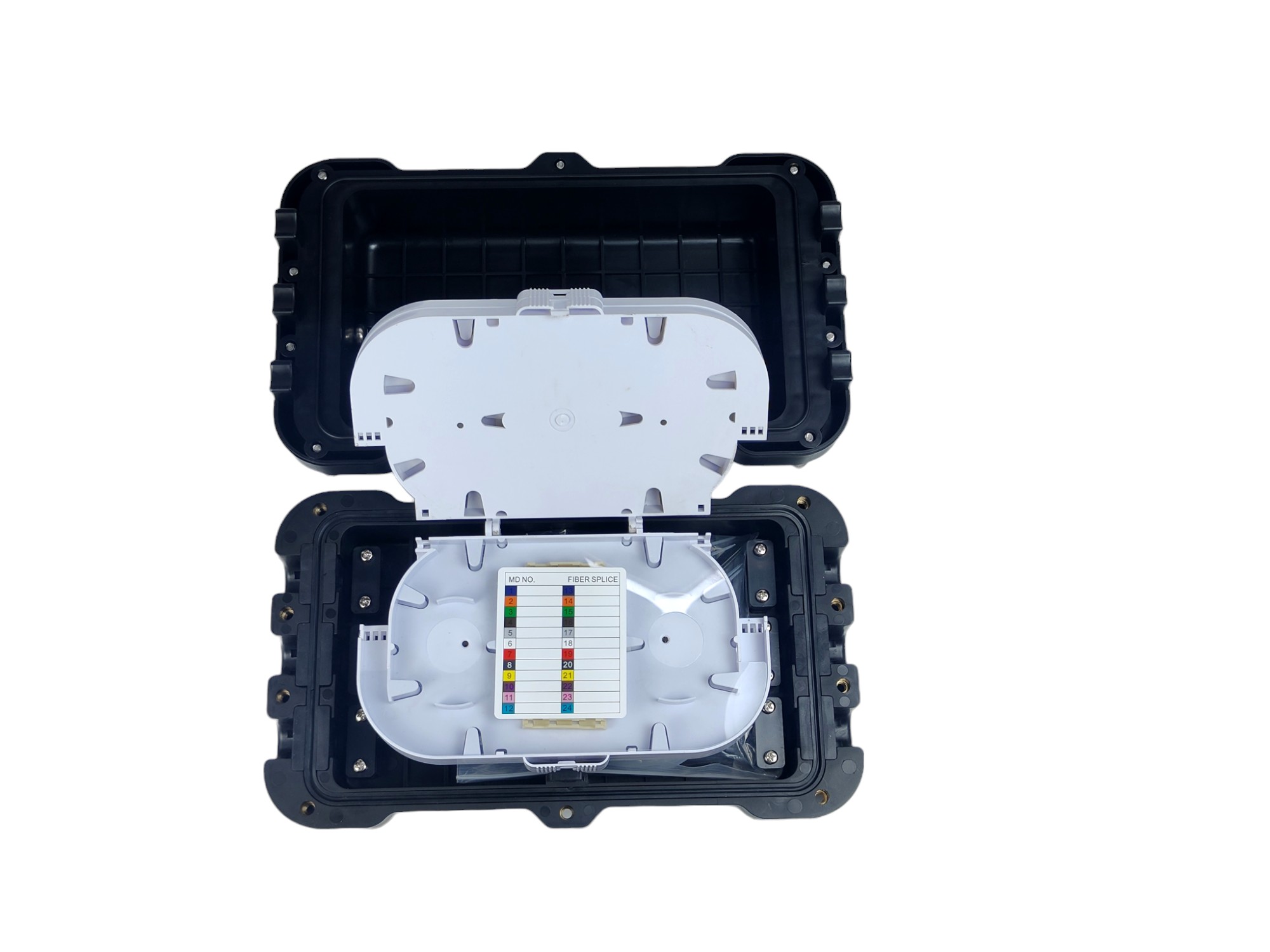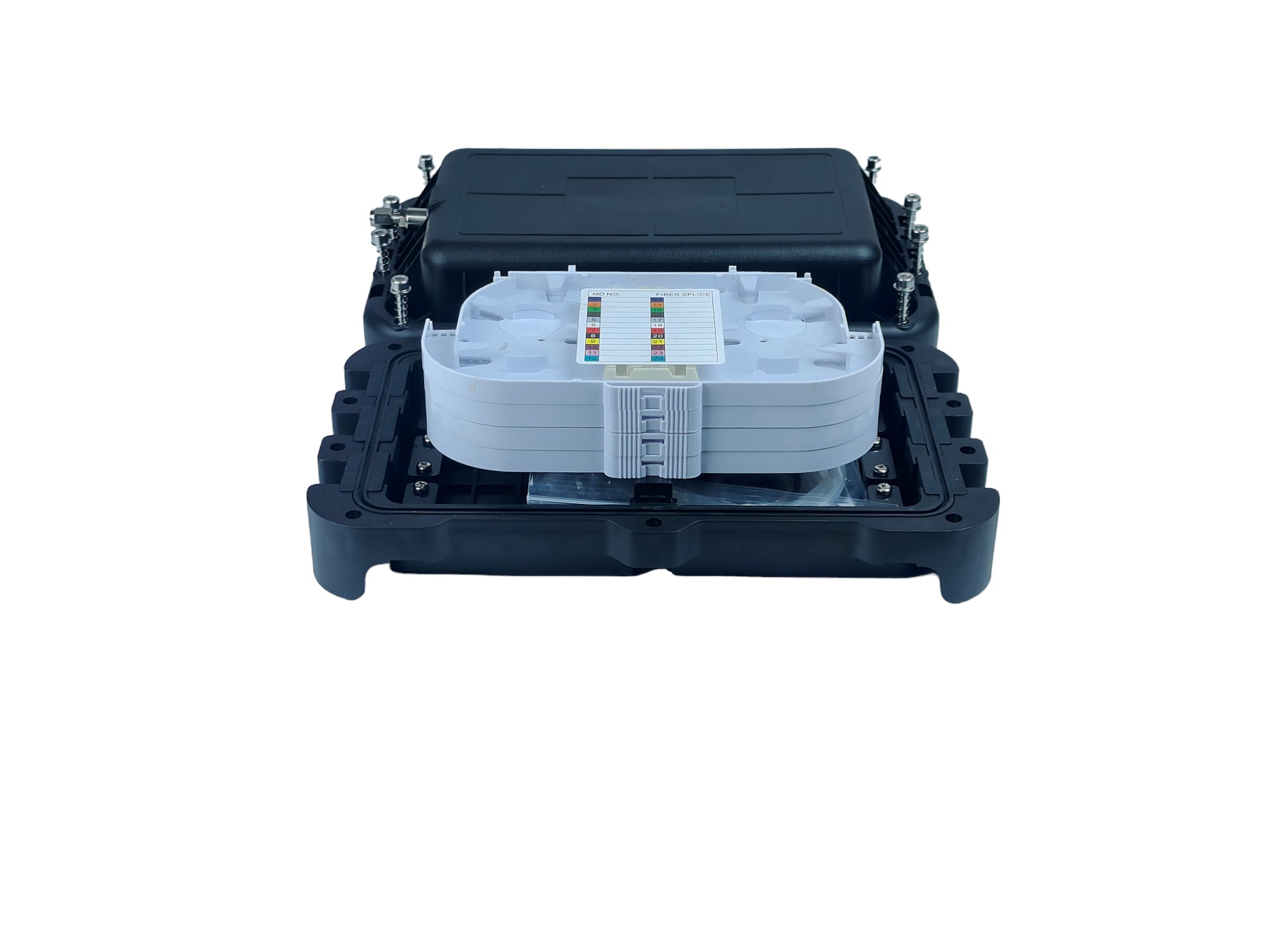 Điểm tiếp xúc giữa nắp măng xông quang 96FO và tại các lỗ để cáp quang ra vào đều được bố trí gioăng và lớp lót cao su. Đáp ứng tiêu chuẩn IP66, cùng tính chống bụi, chống nước tối ưu. Nhằm giúp bảo vệ an toàn tuyệt đối cho cáp quang ở mức tốt nhất.